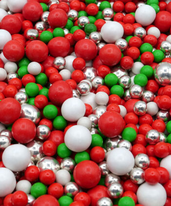 Uma conjugação de esferas crocantes e pérolas de chocolate nas cores mais clássicas de natal. As suas sobremesas vão ficar mais bonitas e ainda mais saborosas.