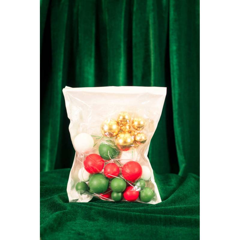 – 8 de 2 cm (2 vermelhas, 2 verdes, 2 brancas e 2 douradas) , 8 de 2,5 cm (2 vermelhas, 2 verdes, 2 brancas e 2 douradas) , 8 de 3 cm (2 vermelhas, 2 verdes, 2 brancas e 2 douradas) , 8 de 4 cm (2 vermelhas, 2 verdes, 2 brancas e 2 douradas).