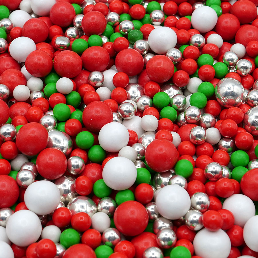 Uma conjugação de esferas crocantes e pérolas de chocolate nas cores mais clássicas de natal. As suas sobremesas vão ficar mais bonitas e ainda mais saborosas.
